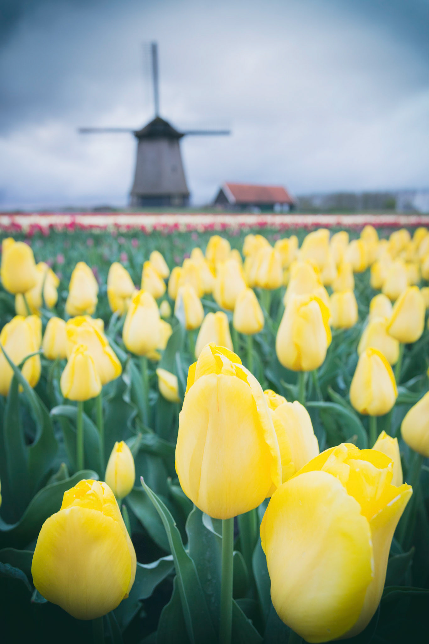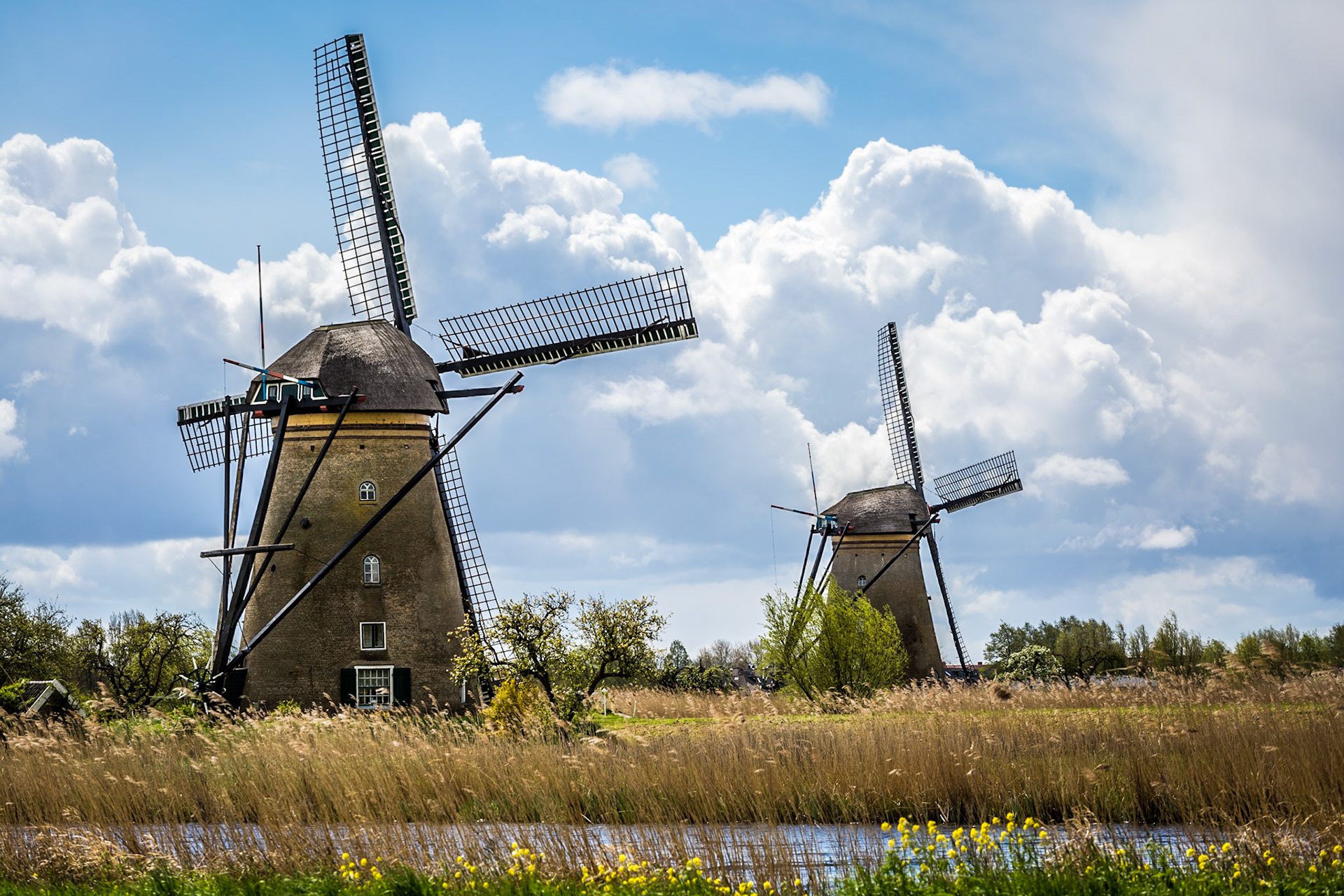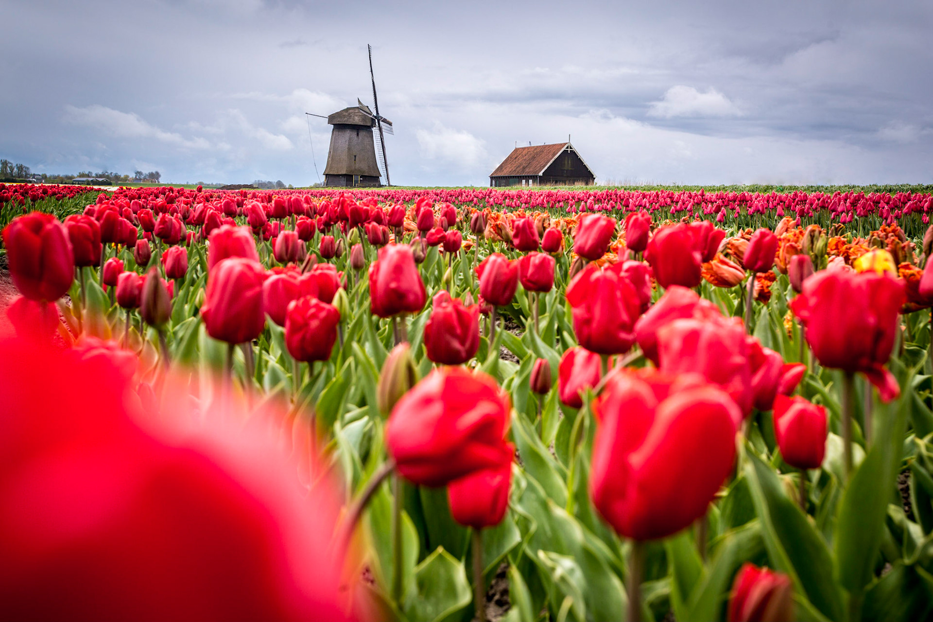 Windmills and tulip fields full of flowers in Netherland