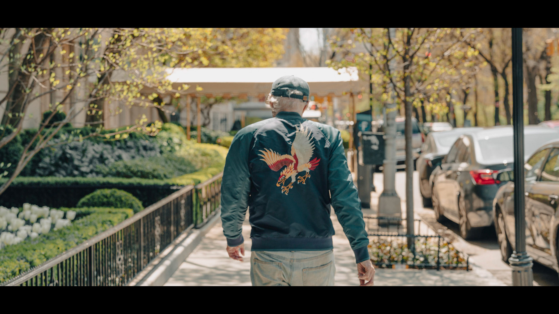 We see Tom from behind, walking next to luxury hotels. He is wearing a bomber jacket with a large embroidered eagle.