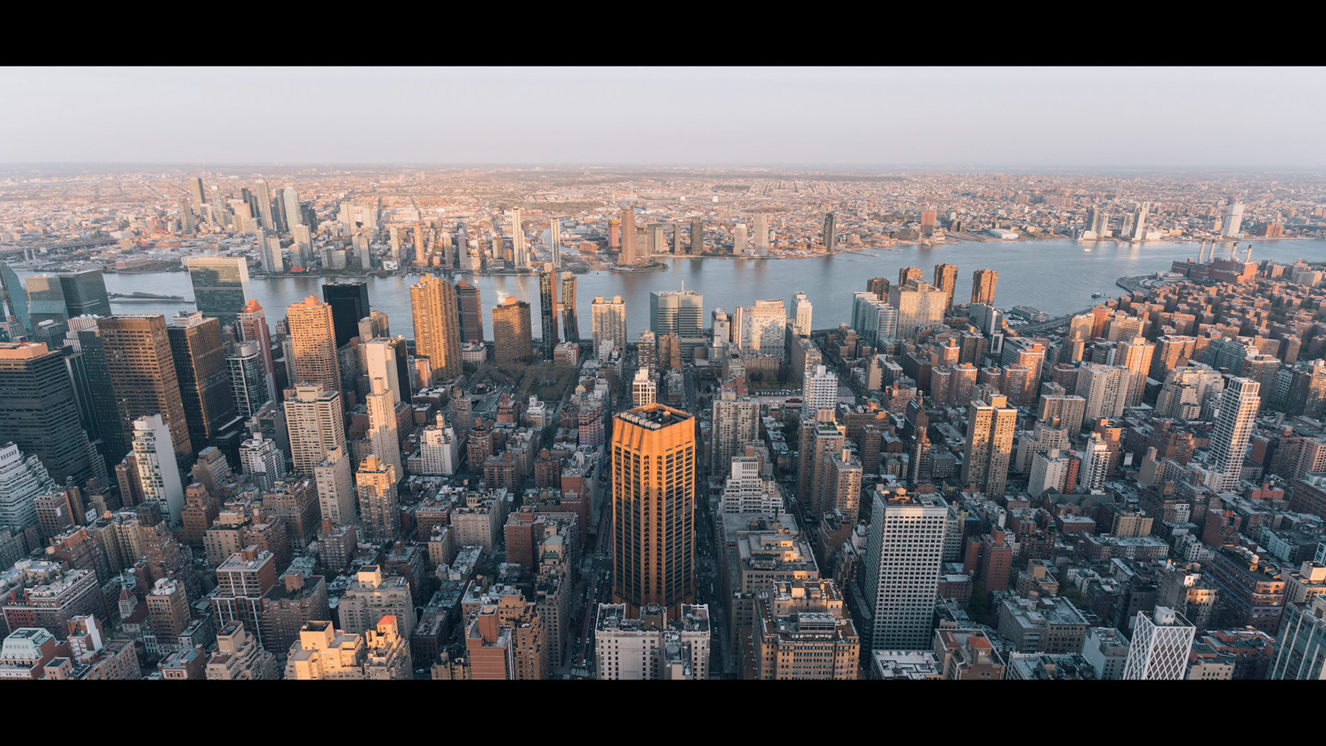 Aerial shots from above at the golden hour, 35mm. Next scene we see East river cityscape from the grates of the observatory on the Empire State Building - SIGMA 20mm - 35mm - 65mm