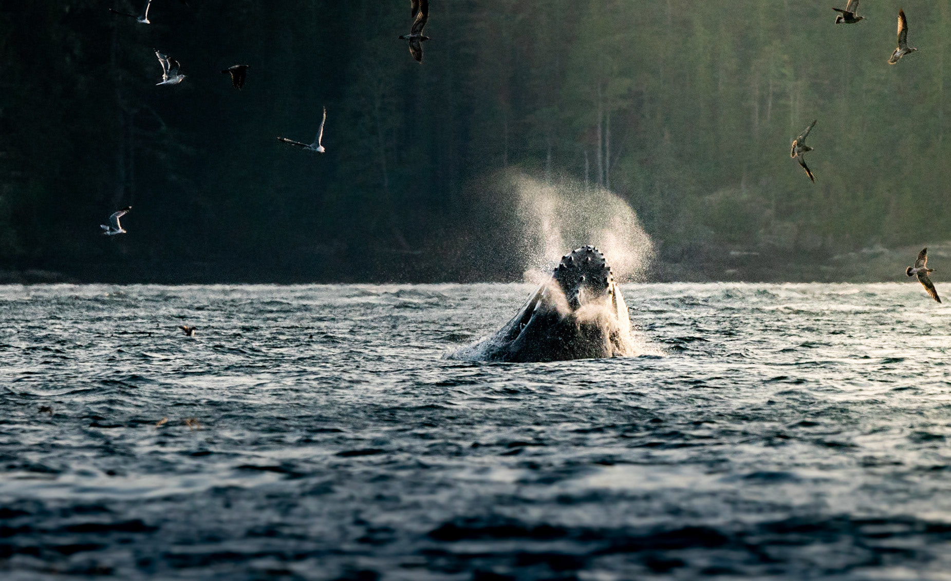 E' un momento intenso ed elettrizzante: ci troviamo a motore spento nel mezzo della baia, con centinaia di volatili a danzare sulle nostre teste, sbuffi di balene all'orizzonte, mentre la luce del tardo pomeriggio si scalda.